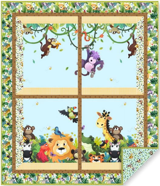 ring a little wild wonder into your sewing room with this playful jungle-themed quilt that feels like a storybook come to life. Sweet safari friends peek through whimsical “window panes,” creating a cheerful design that’s perfect for a nursery, toddler room, or as a treasured handmade gift. Bright colors and adorable animals make every stitch a joy.